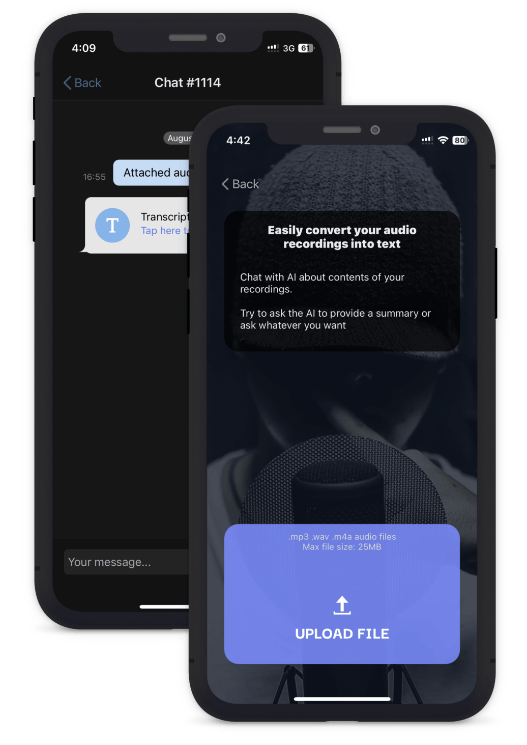 Transcription of audio recordings may be useful if you want to analyze audio recordings without listening to them. In our app you can convert audio files to text and chat with AI about the contents of the recording. AI can summarize it for you or help you understand certain parts that you didn't understand well.